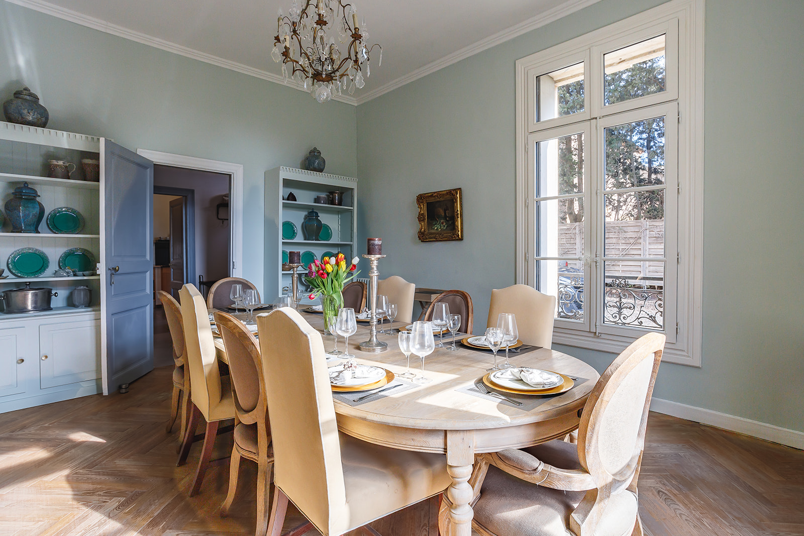Dining room: dual aspect with doors leading onto large terrace overlooking the gardens, parquet flooring, large dining table and chairs for 6 people but can easily be increased to 12.